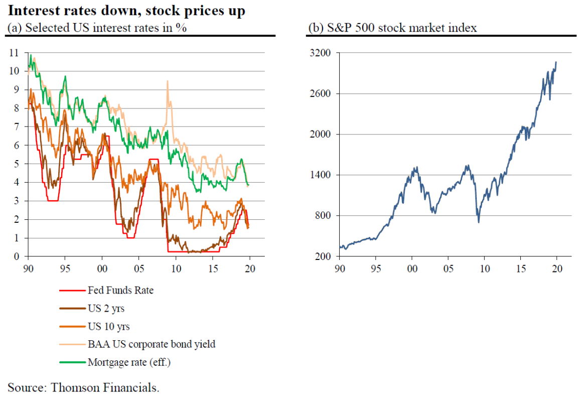 Por lo tanto, no es de extrañar que el descenso de las tasas de interés del mercado en los últimos años se haya visto acompañado de unas cotizaciones bursátiles boyantes, como se ilustra en el gráfico anterior. Sólo para señalar una cosa de nuevo: El descenso de las tasas de interés de mercado es sólo uno de los muchos factores que explican por qué las cotizaciones bursátiles han subido en los últimos años. Pero es un factor significativo, y contribuye a la formación de una burbuja de precios.