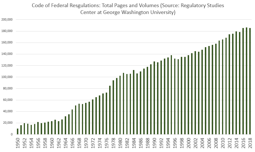 El número de páginas publicadas en el Código de Regulaciones Federales aumentó 710 por ciento de 1960 a 2018, y 37 por ciento en los últimos veinte años. Cada página adicional representa nuevas regulaciones, nuevas reglas, nuevos castigos y nuevas tarifas. Se trata de costes que los empresarios deben afrontar y que los consumidores deben pagar en última instancia. Los proteccionistas que piensan que los fabricantes acudirán en masa a los Estados Unidos de no ser por los bajos aranceles, podrían considerar la carga reguladora que suponen para los empleadores nuestras propias políticas nacionales.