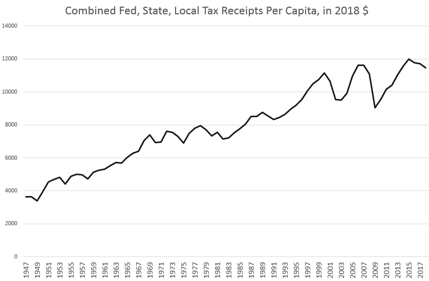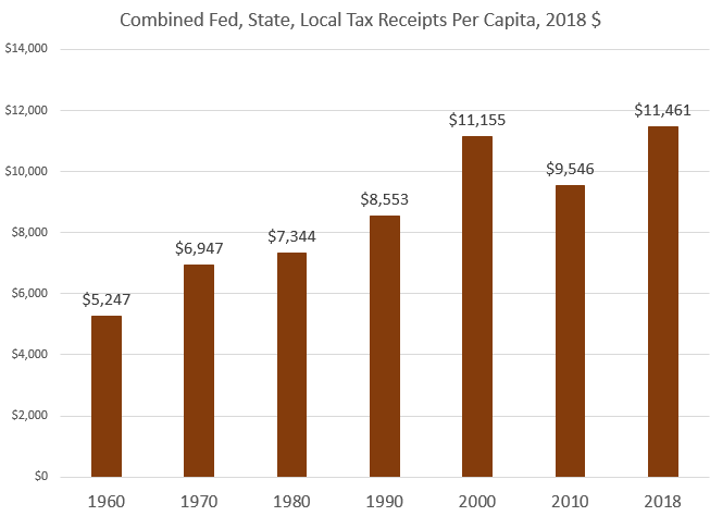 De 1960 a 2018, los ingresos por impuestos federales per cápita aumentaron de $3.523 a $5.973, un aumento del 70 por ciento.