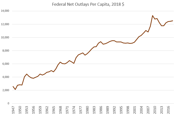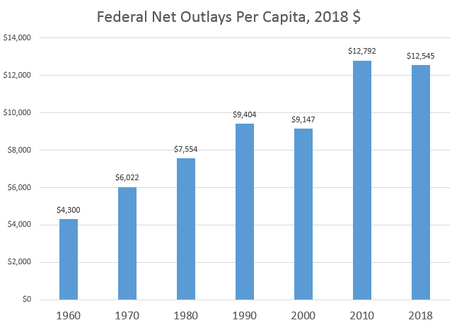 Impulsado por enormes déficits, el gasto federal ha superado a la recaudación de impuestos. El gasto federal per cápita aumentó un 191 por ciento entre 1960 y 2018, pasando de 4.300 a 12.545 dólares.