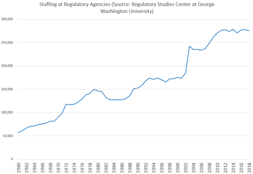 Parte de esto ha sido para pagar los salarios del creciente ejército de empleados federales. Los empleados de las agencias reguladoras se han duplicado en los últimos cuarenta años, pasando de 140.000 puestos equivalentes a tiempo completo en 1978 a 280.000 en la actualidad.